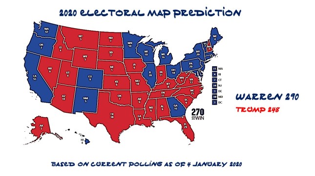 Electoral Map Prediciton Warren v Trump 4 Jan 2020