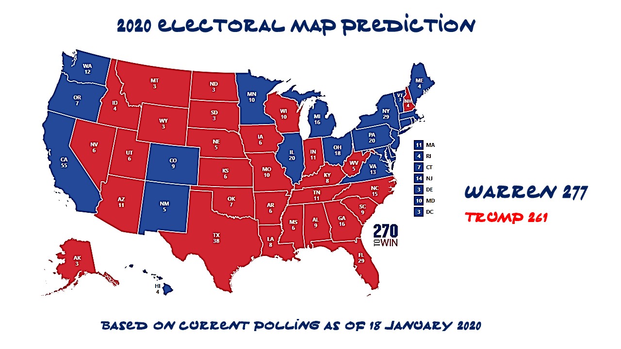 Electoral Map Prediciton Warren v Trump 18 Jan 2020