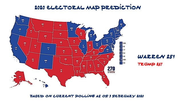 Electoral Map Prediciton Warren v Trump – 3 Feb 2020