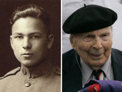 Frank Buckles' enlistment photo into the U.S. Army in 1917, left, and Buckles receives an American flag during Memorial Day activities at the National World War I Museum in Kansas City, May 26, 2008. (AP)