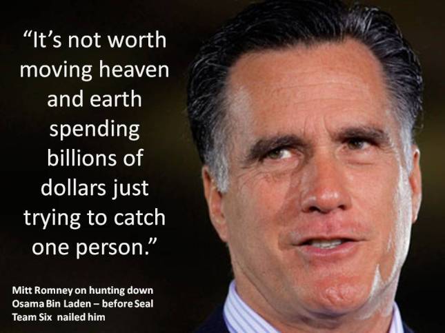 Republican Tea Party (GOTP) presidential footnote Willard Mitt Romney’s view on the importance of finding possibly our worse enemy ever …