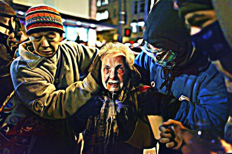 84-year-old, retired school teacher, Dorli Rainey is helped away by fellow activists and doused in milk to treat the effects of police pepper spray at an Occupy Seattle protest.