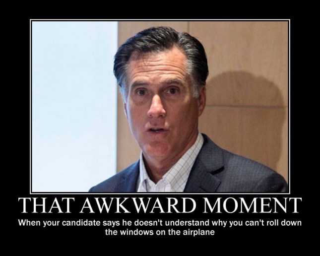 There’s not really anything to add; Mitt’s pretty well said it all, “the windows don’t open. I don’t know why they don’t do that. It’s a real problem. So it’s very dangerous.” Clearly at this point Jeff Foxworthy should show up and have Willard look into the camera and say, “I’m Mitt Romney, and I’m not smarter than a fifth grader.”