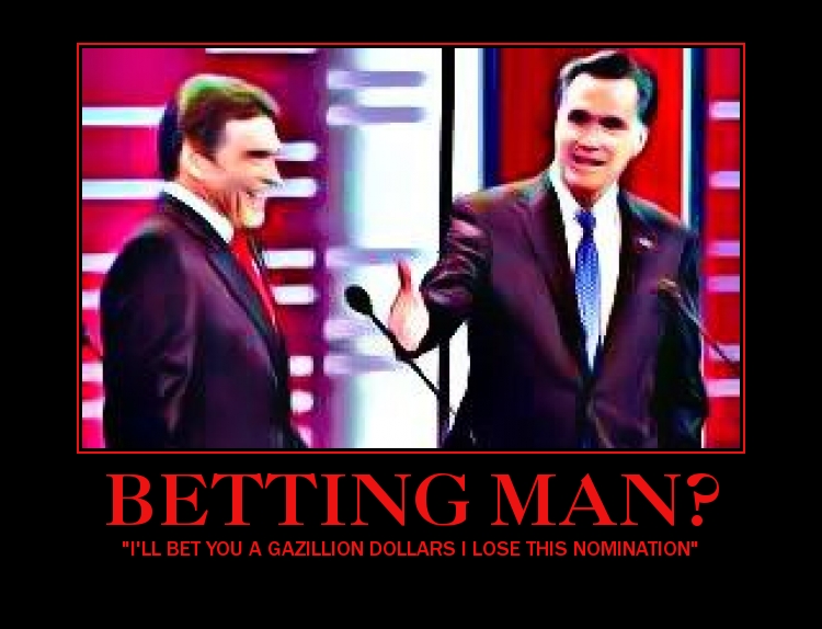 Mittens’ biggest problem is he is out of touch with the 99% of us who aren’t millionaires; he’s got no glue what it’s like to struggle economically. or to lay awake at night trying to figure out how you’ll make this month’s mortgage payment, or how you’ll feed your kids or keep the heat and lights on. He’s a rich kid, and his “bet” was the typical rich kid reaction. Claiming it was “an outrageous number to answer an outrageous charge” is an outrageous statement. To me, an outrageous bet is $10,000, to the rest of the 99% it’s an outrageous bet, to Mittens it’s change found under his sofa cushions.