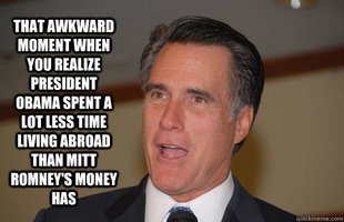 Once again Willard Mittens Romney proves why he’s not presidential; not knowing what’s going on around you might be acceptable in club house of your yacht club but it’s not acceptable in the Oval Office. You also can’t decide that you don’t have to play by the same rules everyone else has to play by. Mittens is not one of us, he’s never worried about where the next month’s rent was going to come from, he’s never worried how they were going to pay for a doctor’s visit for a sick child,and in spite of what he’s said he’s never worried about getting a pink slip.