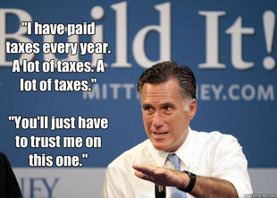 While Democratic Senate Majority Leader, and fellow Latter-day Saint, Harry Reid has raised the question of whether there are years when Willard paid no taxes. Willard continues to mew he’s has paid at least 13 percent of his income in federal taxes every year for the past decade; that’s right folks a whole 13%, but of course we’ll have to trust him on this and simply take his word.